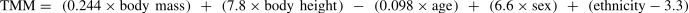 Total muscle mass (TMM) was estimated using the following anthropometric equation24: