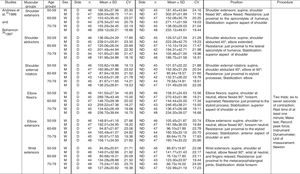| Lannersten et al.48 1993Sweden | n=186; 19–65 years;W/M:90/96 | Electromechanical force transducer (Bofors, Suécia) | Shoulder external rotators, abductors, and flexors; |